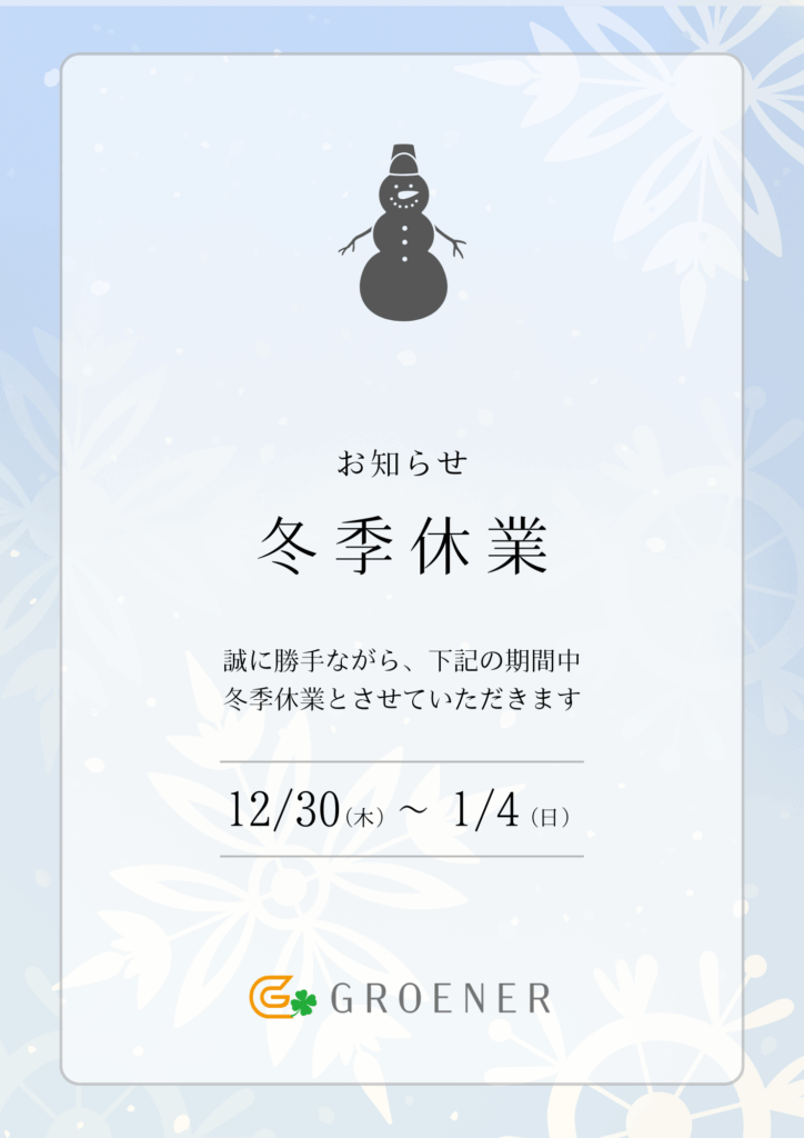 2025.11.27 お知らせ 冬季休業のお知らせ 平素より当社をご利用いただき、誠にありがとうございます。年末年始の営業につきまして、下記の期間を休業とさせていただきます。 本年中のご愛顧に心より御礼申し上げますとともに、来年も変わらぬお引き立てのほどよろしくお願い申し上げます。 記事一覧に戻る
